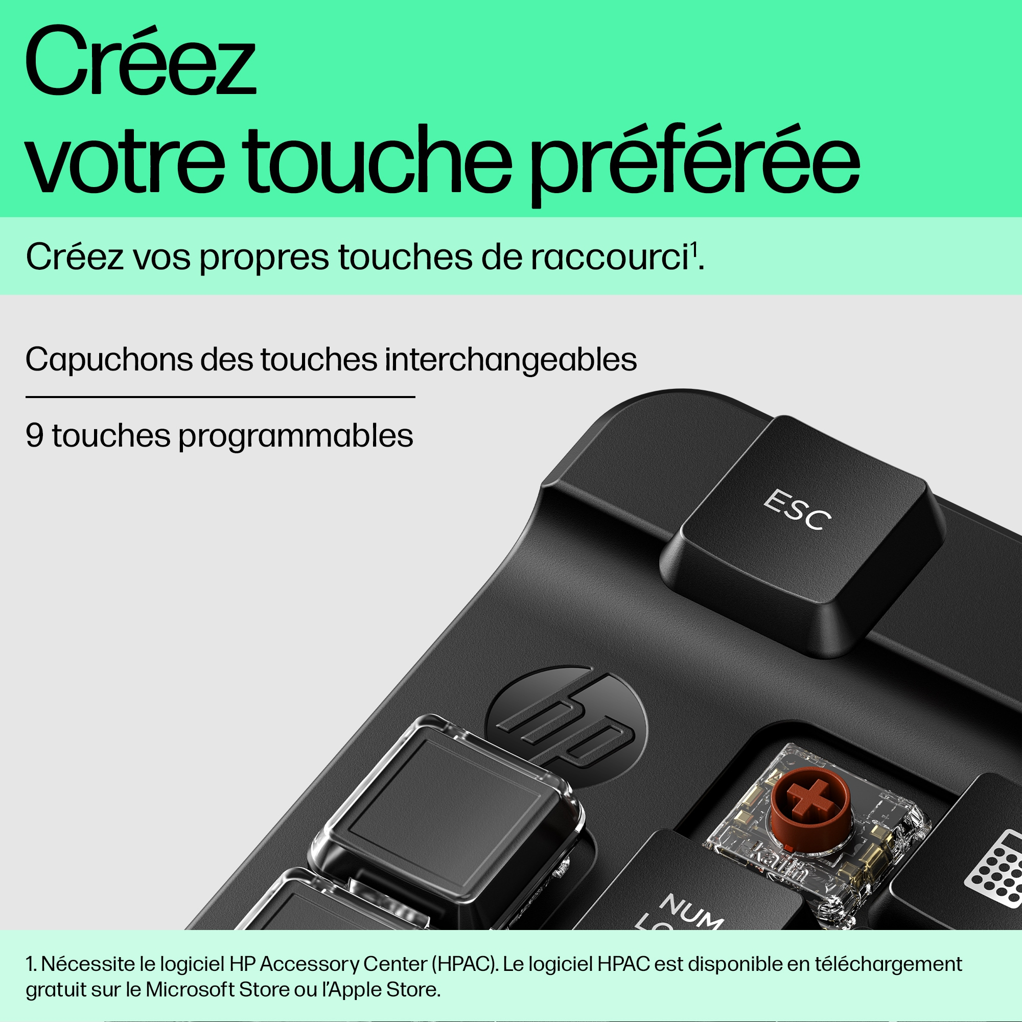 Un pavé numérique et des options en nombre ! Le pavé numérique sans fil programmable HP 430 est entièrement personnalisable[1] et vous offre donc un contrôle total. Outre sa disposition standard, vous disposez d’une colonne de cinq touches vierges à configurer comme bon vous semble. Ce pavé numérique possède neuf touches programmables avec des capuchons de touches interchangeables pour un nombre infini d’options.
