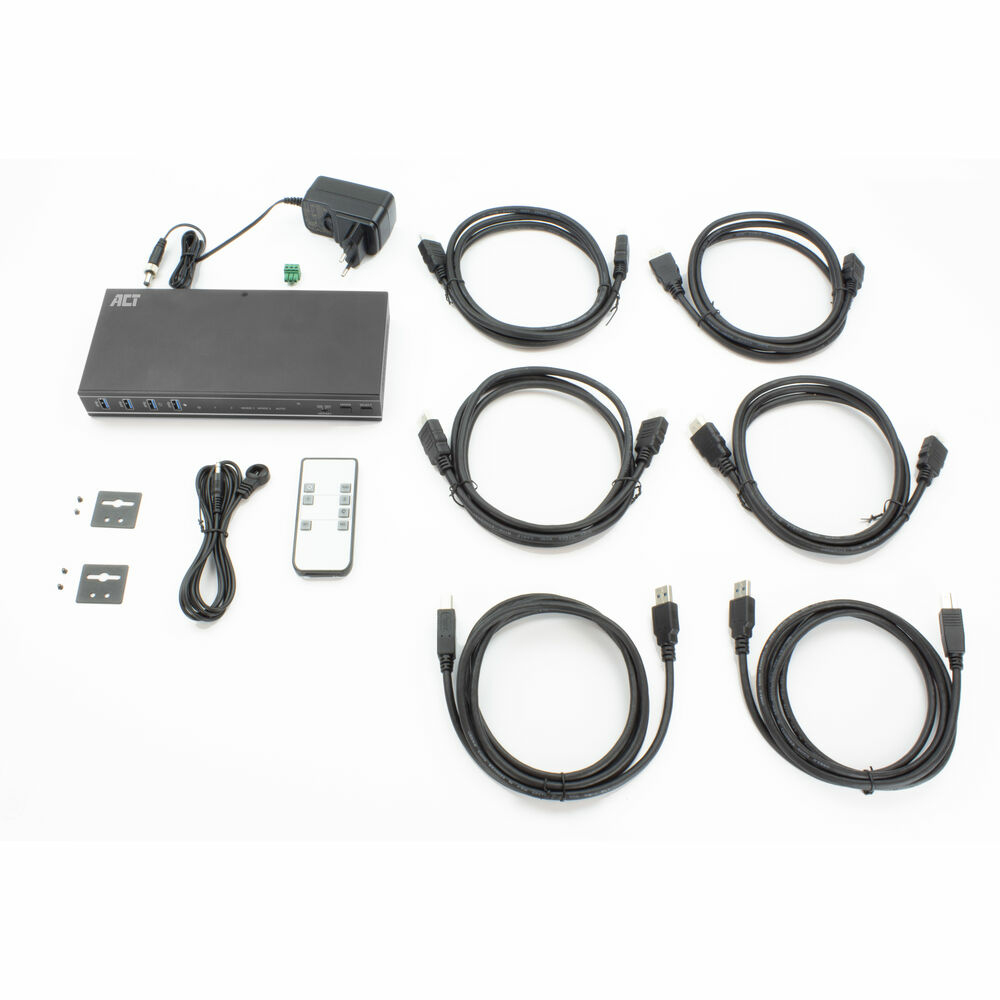 L'AC7914 dispose de quatre ports USB 3.2 Gen1 (USB 3.0) 5Gbps pour partager des périphériques tels qu'un clavier, une souris, une imprimante, etc. Le commutateur dispose également d'une prise audio de 3,5 mm pour connecter un casque ou des haut-parleurs. Les câbles HDMI, les câbles USB, la télécommande, le connecteur RS-232 et les supports de montage sont inclus.