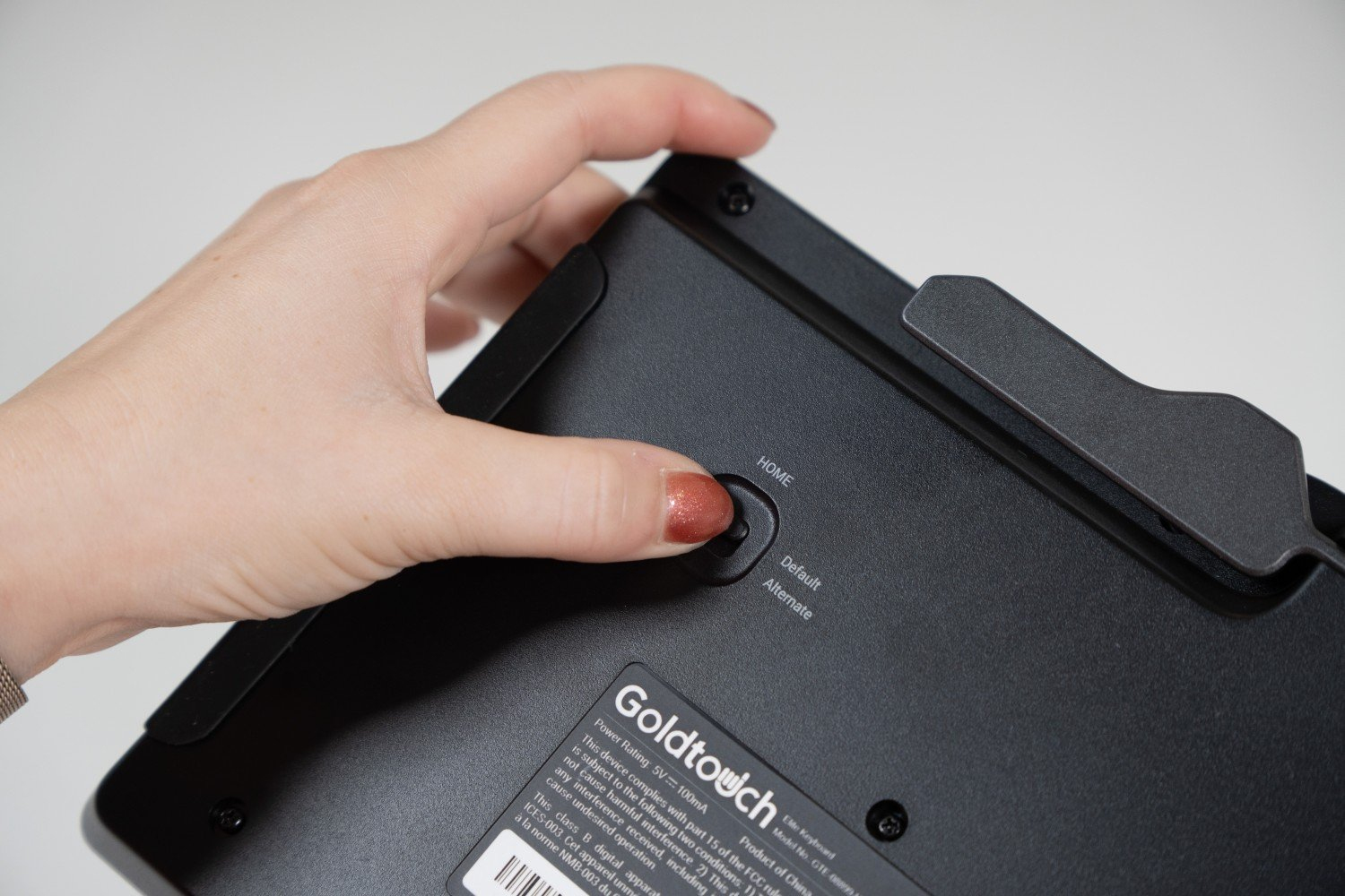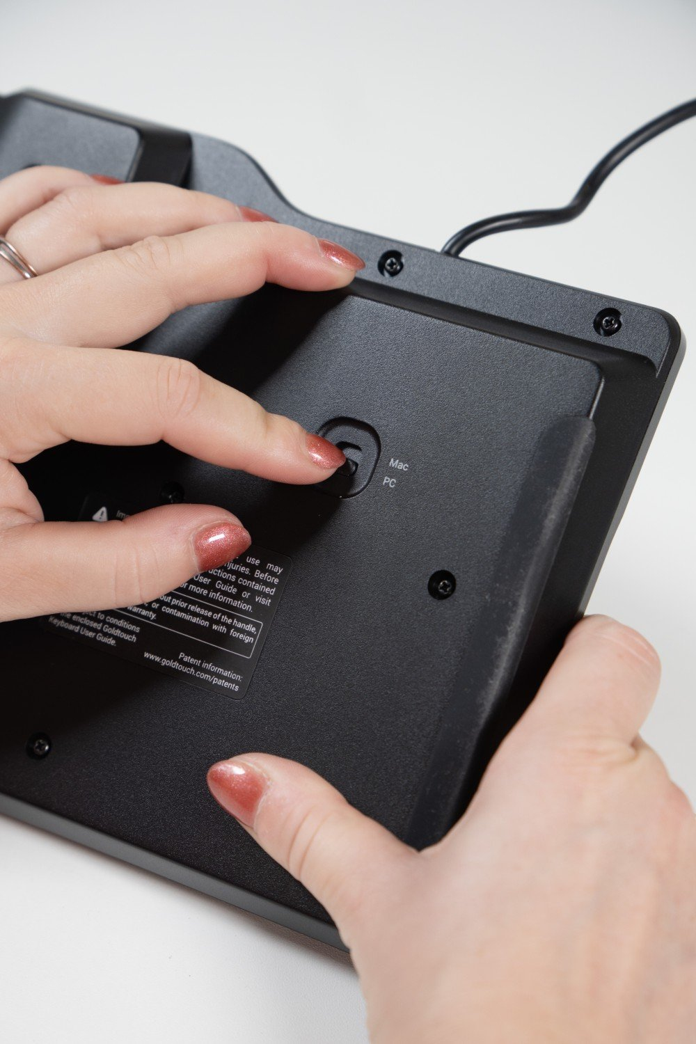 Le Goldtouch Elite est facile à installer. Commencez par appuyer sur la poignée située sur le dessus du clavier. Déplacez ensuite les segments jusqu'à ce que l'angle de chaque panneau corresponde à la ligne naturelle créée par vos doigts sur la rangée centrale des touches. Lorsque vos poignets et vos avant-bras sont dans une position naturelle et confortable à vos côtés, vous pouvez relâcher la poignée. Ce faisant, vous verrouillerez le clavier en position.