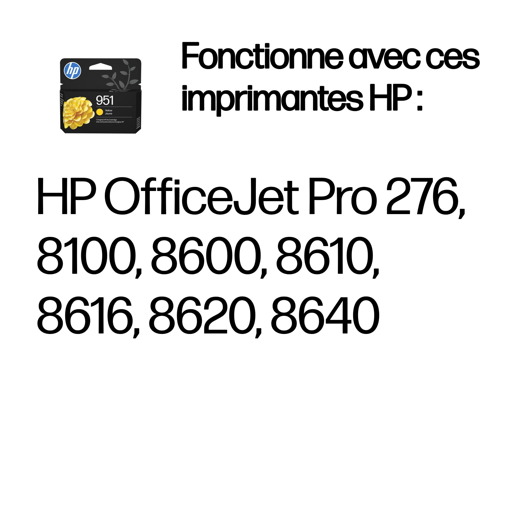 | Compatibilité | Les cartouches d'encre HP 951 fonctionnent avec : HP OfficeJet Pro 276, 8100, 8600, 8610, 8616, 8620, 8640 |
