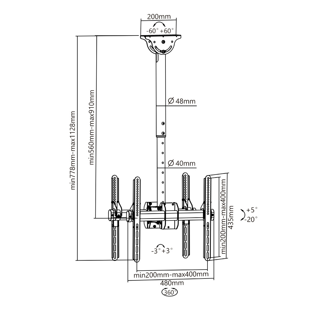 Inclinaison unique de NewStars (25°) et rotation (360°) permet au montage de changer n'importe quel angle pour profiter pleinement des capacités de l'écran plat. Le support est facilement réglable en hauteur de 56 à 91 centimètres. Une gestion des câbles unique, cache et achemine les câbles du plafond à la télévision pour les garder bien rangés.